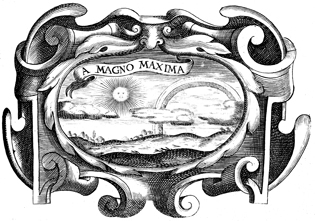 Description: This copper plate engraving depicts a sun rising over a field. The coat of arms and engravings in this book were designed by Silvestro Pietrasanta (1590-1647).