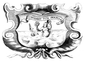 Description: A copper plate engraving depicts a mermaid rising out of the ocean holding a seashell and an olive branch. The coat of arms and engravings in this book were designed by Silvestro Pietrasanta (1590-1647).