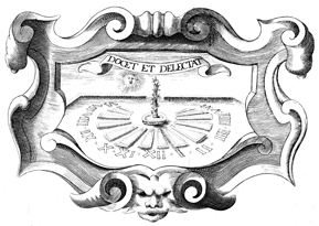 Description: This copper plate engraving depicts a garden structured in a way to function as a sundial. Notice the sun shining in the background with its shadow shown at one o'clock in the garden. The coat of arms and engravings in this book were designed by Silvestro Pietrasanta (1590-1647).