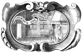 Description: This copper plate engraving depicts an empty room with a fireplace and a smoke screen at one end. The Latin motto above the image roughly translates to, "Very convenient to say without inconvenience." The coat of arms and engravings in this book were designed by Silvestro Pietrasanta (1590-1647) .