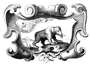 Description: This copper plate engraving depicts a bear eating honey and bees going after the bear. The coat of arms and engravings in this book were designed by Silvestro Pietrasanta (1590-1647).