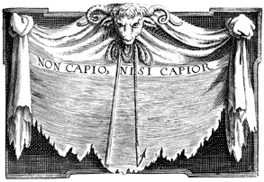 Description: A copper plate engraving with the image of a ram's head caboshed with a staff and a harpoon. The coat of arms and engravings in this book were designed by Silvestro Pietrasanta (1590-1647).