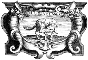 Description: This copper plate engraving depicts a beast licking its wounds, seemingly shortly after an altercation. The coat of arms and engravings in this book were designed by Silvestro Pietrasanta (1590-1647).