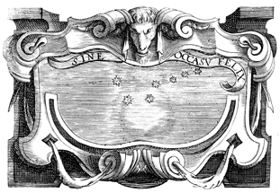Description: This copper plate engraving consists of an image of a constellation that the author equates to luck. The coat of arms and engravings in this book were designed by Silvestro Pietrasanta (1590-1647).