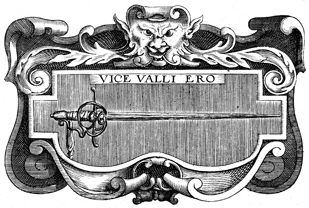 Description: This copper plate engraving contains an image of a sword with a tassel attached to the handle. The coat of arms and engravings in this book were designed by Silvestro Pietrasanta (1590-1647).