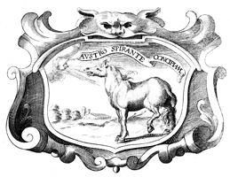 Description: A copper plate engraving with the image of the sun shining on a white horse. The coat of arms and engravings in this book were designed by Silvestro Pietrasanta (1590-1647).