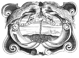 Description: A copper plate engraving depicting chains attached to a double-headed eagle. The coat of arms and engravings in this book were designed by Silvestro Pietrasanta (1590-1647).