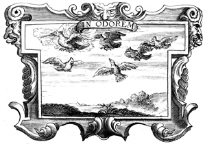 Description: This copper plate engraving depicts a group of doves, or a dule, flying over a field. The coat of arms and engravings in this book were designed by Silvestro Pietrasanta (1590-1647).