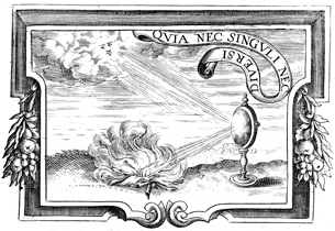 Description: A copper plate engraving depicts the placing of a mirror, or magnifying glass, at an angle in order to light a fire using the rays from the sun. The coat of arms and engravings in this book were designed by Silvestro Pietrasanta (1590-1647).