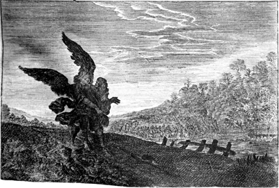Description: After sending his family ahead of him (background), an angel appears to Jacob and wrestles with him throughout the night.