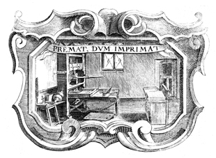 Description: A copper plate engraving illustrates the inside of a workshop consisting of a printing press. The printing press in this image is an example of one from the 17th century. The coat of arms and engravings in this book were designed by Silvestro Pietrasanta (1590-1647).