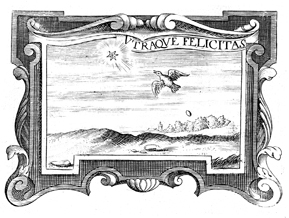 Description: A copper plate engraving illustrates a bird flying away from the ground and directly towards a star. The coat of arms and engravings in this book were designed by Silvestro Pietrasanta (1590-1647).