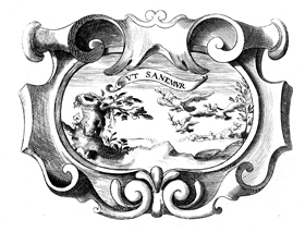 Description: This copper plate engraving illustrates birds returning to an area that is filled with life. The coat of arms and engravings in this book were designed by Silvestro Pietrasanta (1590-1647).