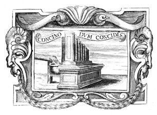 Description: A copper plate engraving with a drawing of a water organ. Water organs are a type of pipe organs where the source of power pushing the air through the pipes is from water. The coat of arms and engravings in this book were designed by Silvestro Pietrasanta (1590-1647).
