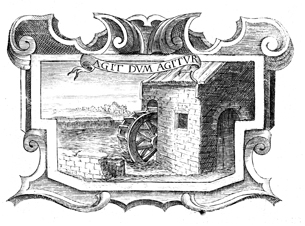 Description: This copper plate engraving contains an illustration of a watermill situated next to a river. The coat of arms and engravings in this book were designed by Silvestro Pietrasanta (1590-1647).