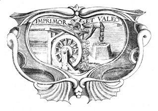 Description: This copper plate engraving illustrates a minting machine powered by water. The coat of arms and engravings in this book were designed by Silvestro Pietrasanta (1590-1647).