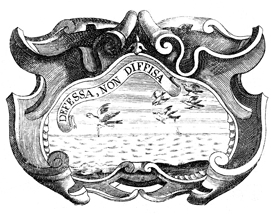 Description: A copper plate engraving contains the illustration of a group of birds over water, with a sailboat in the background. Each bird carries a piece of wood in its claws. The coat of arms and engravings in this book were designed by Silvestro Pietrasanta (1590-1647).