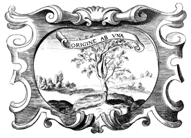 Description: A copper plate engraving with an artistic rendition of the tree of the knowledge of good and evil in the Garden of Eden. The Latin motto above the tree reads, "From the beginning." The coat of arms and engravings in this book were designed by Silvestro Pietrasanta (1590-1647).