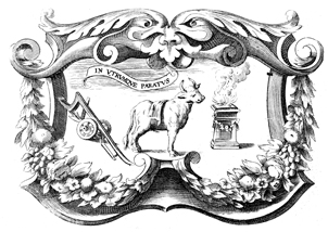 Description: A copper plate engraving with a plow, an ox, and a sacrifice altar, elements that were present in the life of Israelites according to the Hebrew Bible. The coat of arms and engravings in this book were designed by Silvestro Pietrasanta (1590-1647).