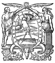 Description: This tailpiece is the printer's mark of the Plantin Press, located in Antwerp, Belgium. The image illustrates Adam and Eve on either side of the motto and compass located in the center of the image. .