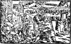 Description: In the front, the landowner pays the laborers for the day's work. In the background, some work in the vineyard, while the landowner recruits others to go work in the vineyard.