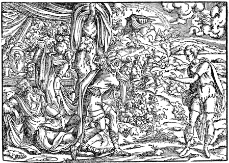 Description: Ham dishonors Noah by pointing out his nakedness, but Shem and Japheth avert their eyes as they cover their father with a cloth. This woodcut is the work of engraver Jost Amman (1539-1591).
