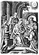 Description: A depiction of the Magi bringing gifts to the infant Jesus Christ.