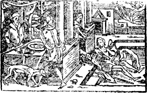 Description: Lazarus sits at the gate of the rich man, who lives in luxury. In the rear, the rich man begs Abraham to allow Lazarus to put water on his tongue to quench his torment.