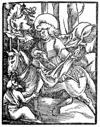 Description: Depiction of Saint Martin riding a horse while a man watches him from the ground.