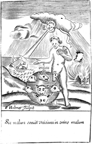 Description: A man is shown intently looking at a sphere with various types of animal heads. In the background to the left is a boat in turbulent waters at sea while on the right a home is burning.