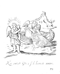 Description: A man is shown entangled in fishing nets while an angel attempts to free him from his entanglement.