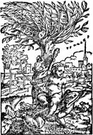 Description: The printer's device of Christoph Froschauer (1532-1585) of Zurich. The inclusion of a man riding a frog in front of a tree in this device is a play on his surname (Frosch = Frog), which means 'frog meadow'.