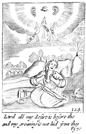 Description: A depiction of Psalm 30 of an injured man praising God that he survived the battle. The eye and ears of God is shown in the sky above the man.