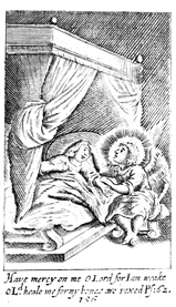 Description: A woman is shown lying in bed, seemingly due to illness or pain. Next to her is an angel sent to comfort her.