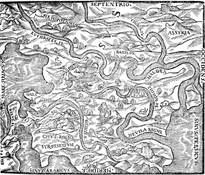 Description: Map of the location of Garden of Eden, depicting the fall and the crossing of the Red (Reed) Sea.