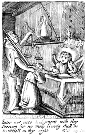 Description: A man is brought before an angel in order to be judged on how well he followed the Law of God. The ten Commandments appears in the background behind the angel.