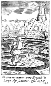 Description: A man is shown standing on top of a garden maze with a compass in his hand. The compass is attached to a statue, which may represent God's law.