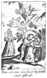 Description: An angel is shown covering an individual's eyes from a vain individual, shown behind the angel.