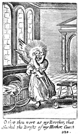 Description: An illustration of a mother holding an angel at her chest, much like she would do when nursing her own child, in the nursery.