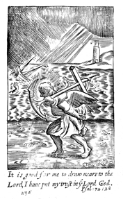 Description: A man holding an anchor is shown on the back of an angel. The angel is carrying the man through the wind and the rain, ideally to a better place.