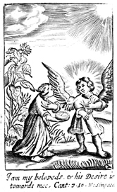 Description: A woman and her beloved are shown in a garden. The woman is shown offering her beloved, the angel on the right, an item.