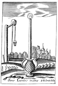 Description: A lit candle stick is shown in its vase-like holder. Next to the candle is a pulley system, which may represent the interplay between good and evil.