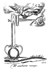 Description: An angel is shown protecting the candle light, which here symbolizes God's people, with a sheet of paper while another angel attempting to blow out the light.