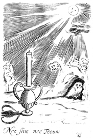 Description: An owl, which here is the personification of death and wickedness, is shown hiding in a dark cave away from the bright light of the candle and the sun.