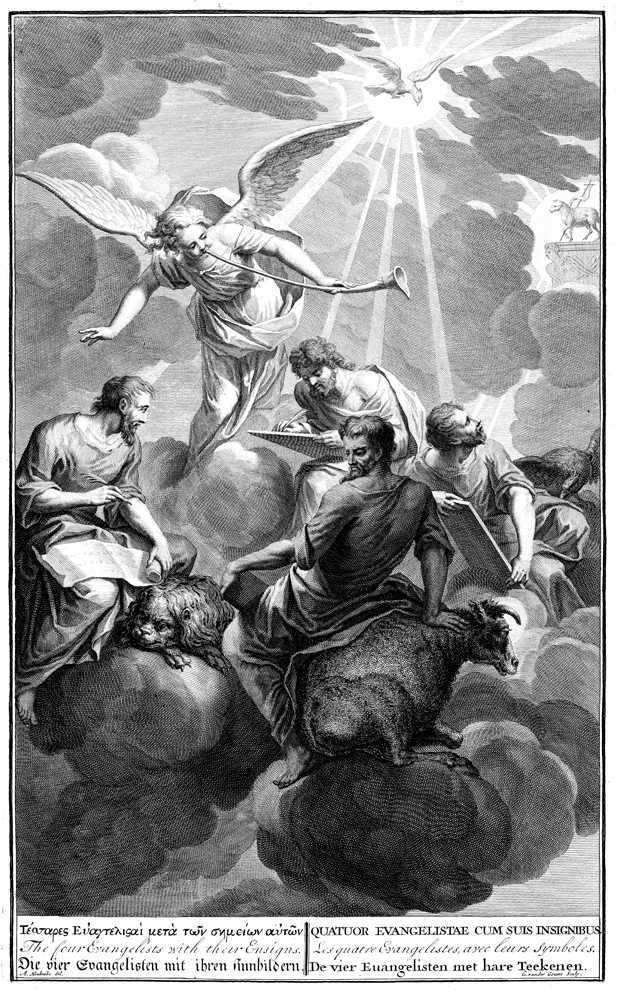 Description: The four evangelists sit in a circle in the clouds accompanied by their attributes as the holy spirit shines above and the lamb holds a banner to one side. Engraved by G. vander Gouwen from the design of Arnold Houbraken.