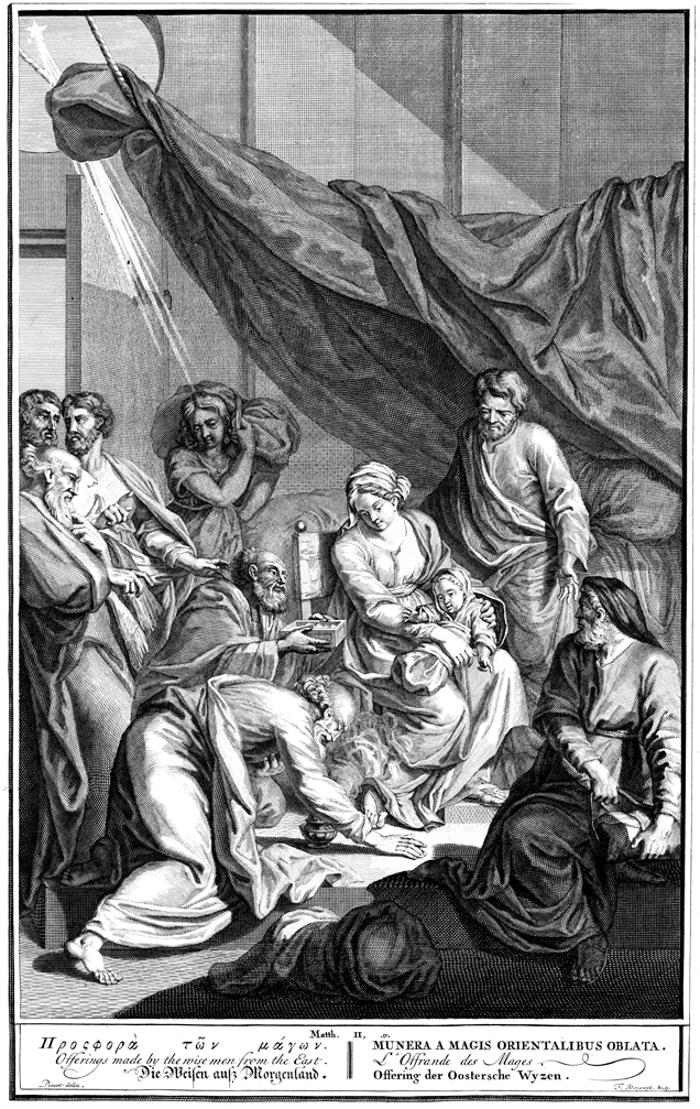 Description: The wise men and servants adore the baby Jesus in Mary’s arms as a star shines thin rays down on the scene. Engraved by F. Bleyswyk from the design of Bernard Picart (1673-1733).