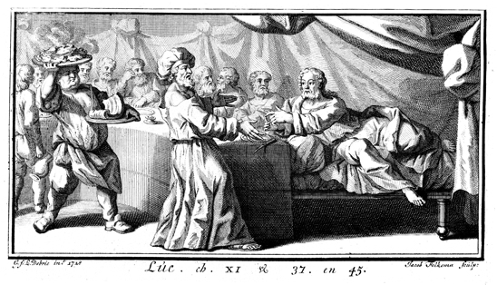 Description: Jesus reclines for a meal and rebukes the Pharisees for washing their hands but not being righteous. Engraved by Jacob Folkema (1692-1767) from the design of G. F. L. Debrie.