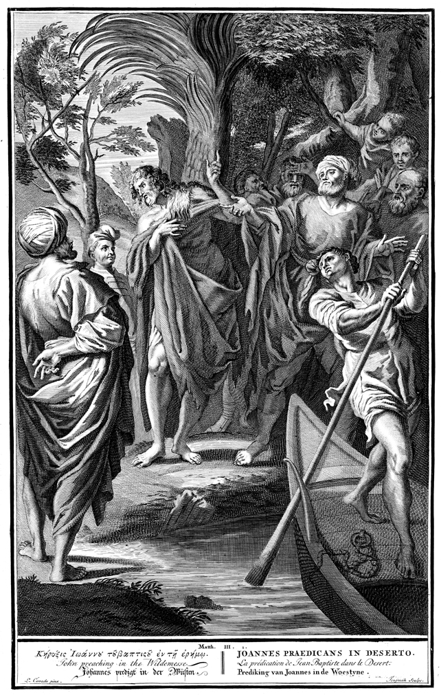 Description: John the Baptist preaches in the wilderness on the banks of a river. Engraved by E. Jongman from the design of L. Carrache.