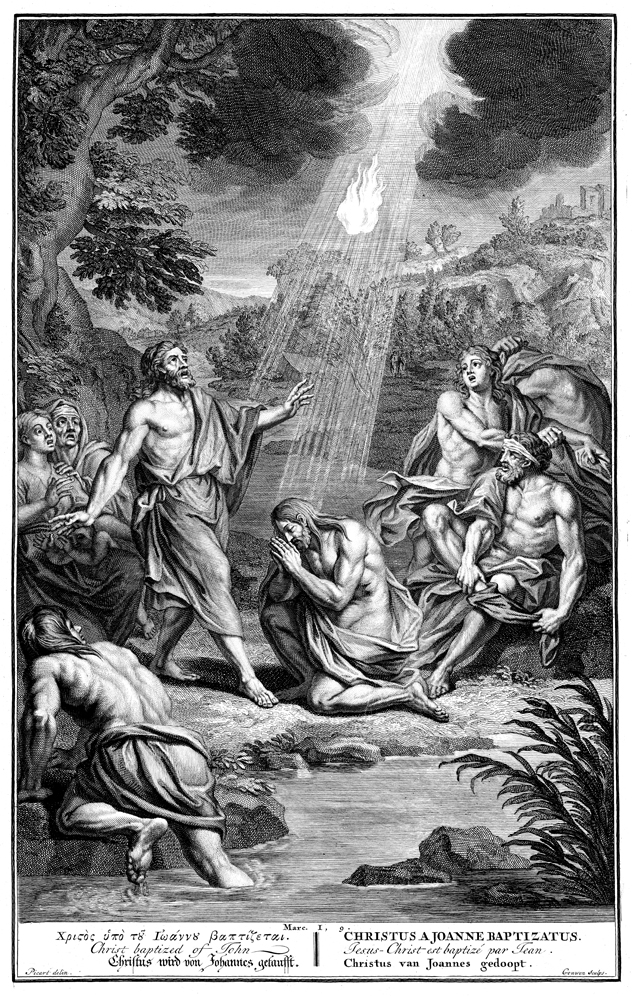 Description: The Holy Spirit in the form of a sunlit flame descends on a praying Jesus as John the Baptist and others look on in awe. Engraved by G. vander Gouwen from the design of Bernard Picart (1673-1733).