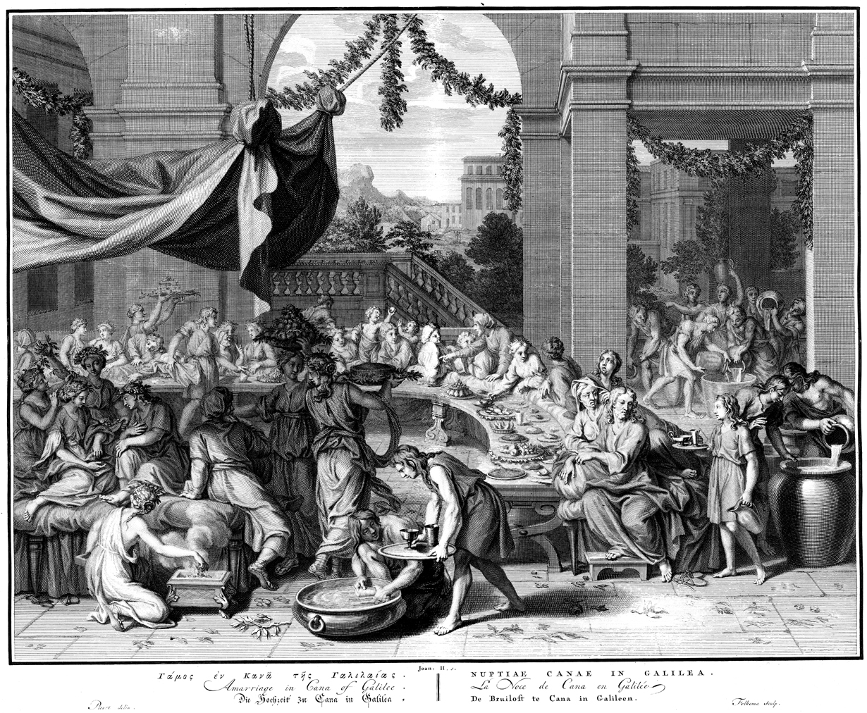 Description: Jesus turns to a cupbearer as Mary looks over his shoulder, and servants in the background pour water from jars into larger basins. Women with garlands in their hair are attended by many servers opposite Jesus. Engraved by Jacob Folkema (1692-1767) from the design of Bernard Picart (1673-1733).